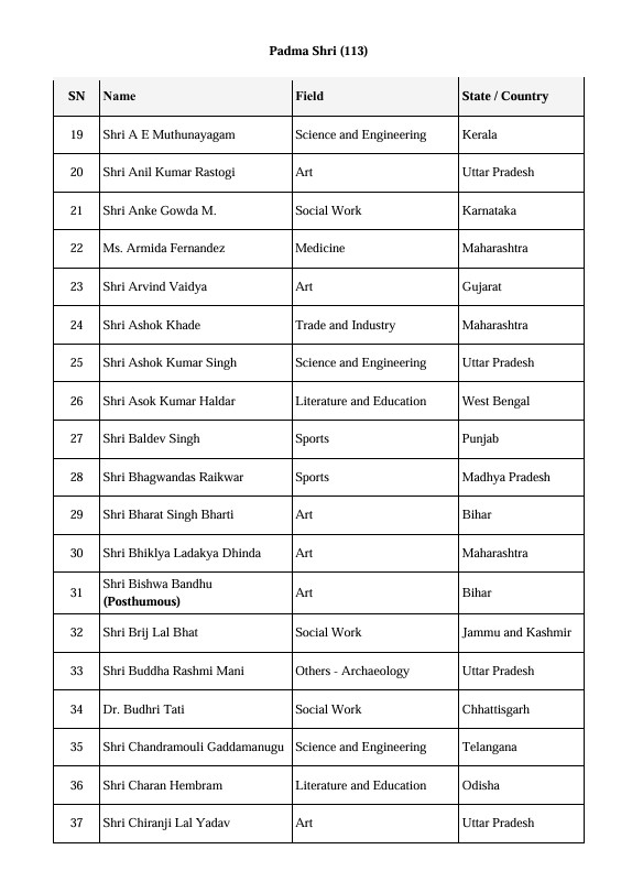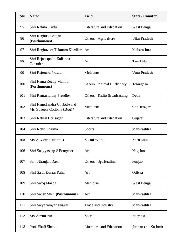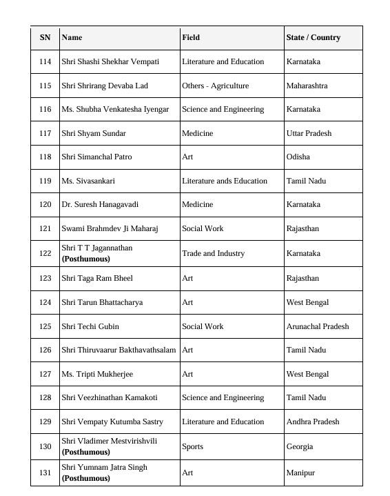 इसके अतिरिक्त विभिन्न क्षेत्रों में उल्लेखनीय योगदान देने वाली 113 हस्तियों को पद्मश्री सम्मान प्रदान किए जाने की घोषणा की गई है।