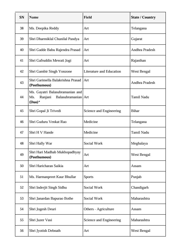 विभिन्न क्षेत्रों में विशिष्ट सेवा के लिए निम्नलिखित व्यक्तियों को पद्म भूषण सम्मान प्रदान किया जाएगा: