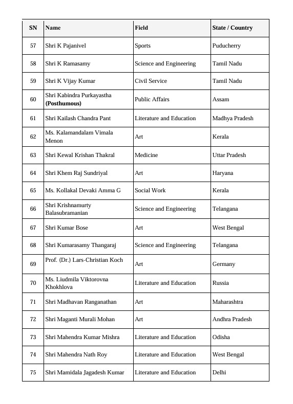 - वी. एस. अच्युतानंदन (मरणोपरांत) – लोक कार्य (केरल)